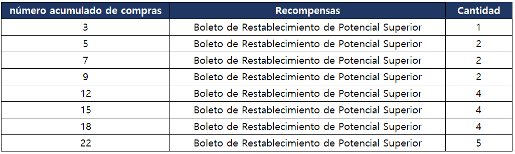 - Puedes obtener las siguientes recompensas según el número acumulado de compras del Paquete Premium de Restablecimiento Potencial.