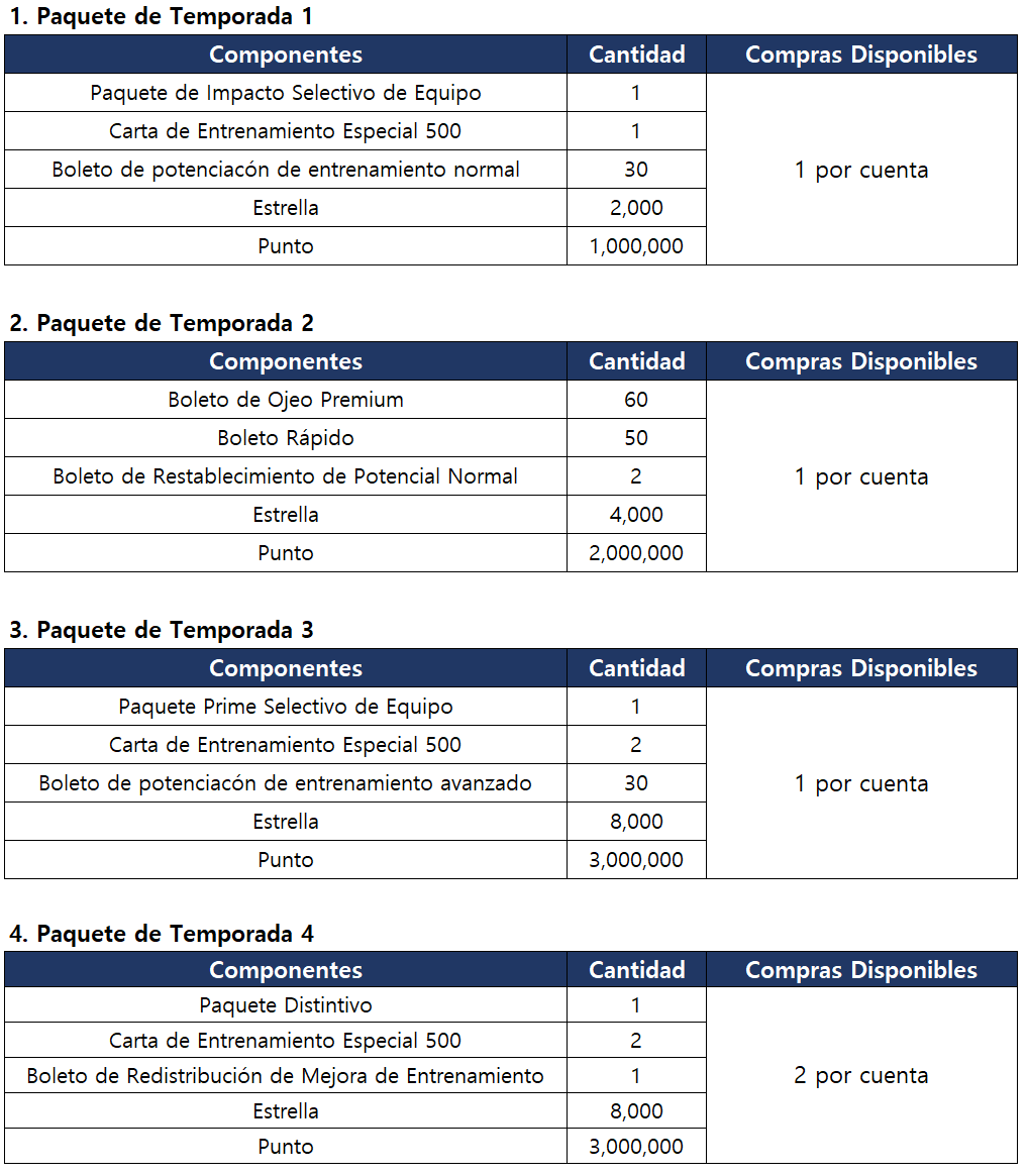 Nos gustaría avisarles sobre el [Paquete de Temporada] que incluye artículos de desarrollo, como el Paquete Distintivo y el Paquete Prime de Selección del Equipo.