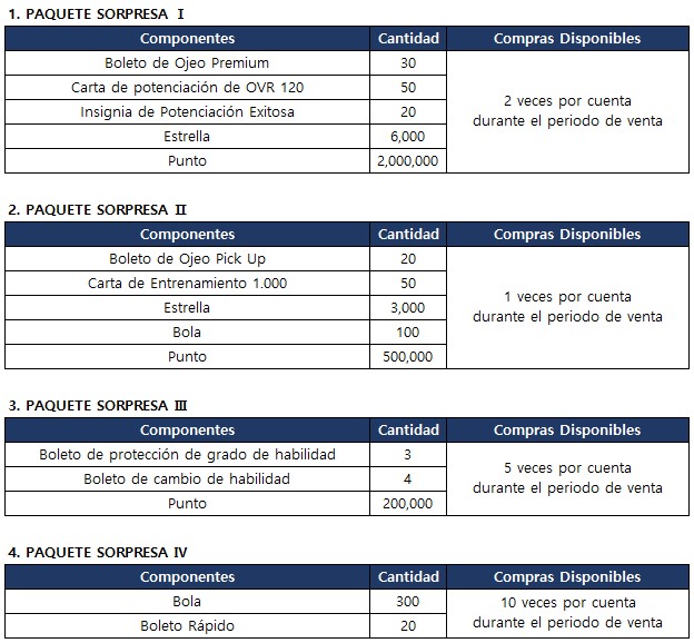 El [Paquete Sorpresa] que ofrece muchos boletos del ojeo y Boleto de Protección del Grado de Habilidad, que son esenciales para el desarrollo de tu jugador, está disponible.