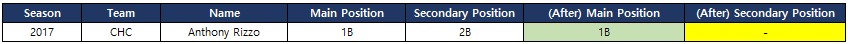 - - La posición secundaria de la tarjeta de jugador de Anthony Rizzo '17 se eliminará ya que se aplica una posición secundaria incorrecta.