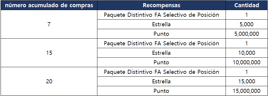 - Puedes obtener las siguientes recompensas según el número acumulado de compras del Paquete Especial Selectivo de Posición.