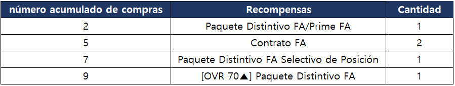 - Puedes obtener las siguientes recompensas según el número acumulado de compras del Paquete Premium FA.
