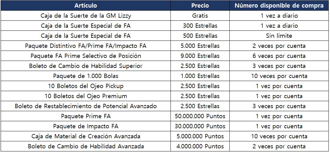 Estará disponible la [Tienda de Evento Especial] donde puedes comprar la Caja de la Suerte de Lizzy 1 vez gratis al día y varios productos con Estrellas y Puntos.