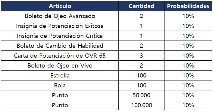 - Puedes obtener 1 de los siguientes componentes, todos los artículos tienen la misma probabilidad de aparecer.