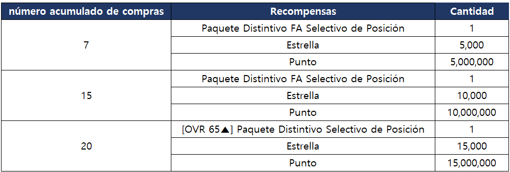 - Puedes obtener las siguientes recompensas según el número acumulado de compras del Paquete Especial Selectivo de Posición.