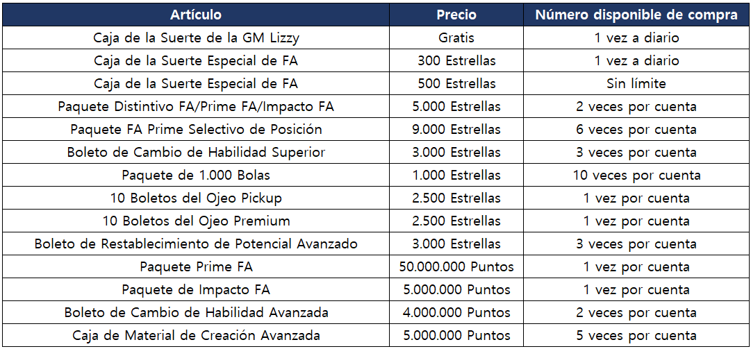 Estará disponible la [Tienda de Evento Especial de FA] donde puedes comprar la Caja de la Suerte de Lizzy 1 vez gratis al día y varios productos con Estrellas y Puntos.