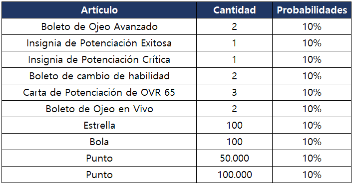- Puedes obtener 1 de los siguientes componentes, todos los artículos tienen la misma probabilidad de aparecer.
