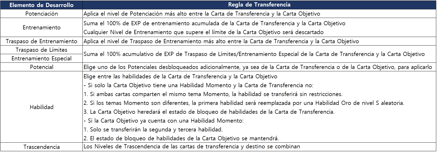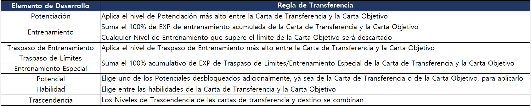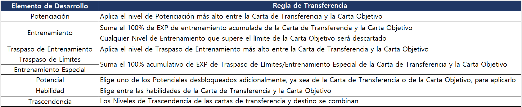 - Los valores de Potenciación y Traspaso de Entrenamiento en la carta de destino se restablecerán después de la transferencia.