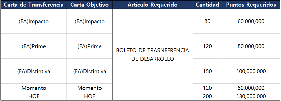 - La Transferencia de Desarrollo en la Misma Posición está disponible entre cartas de la misma rareza y posición: Impacto, Prime, Distintiva (incluyendo FA), Momento o HOF.