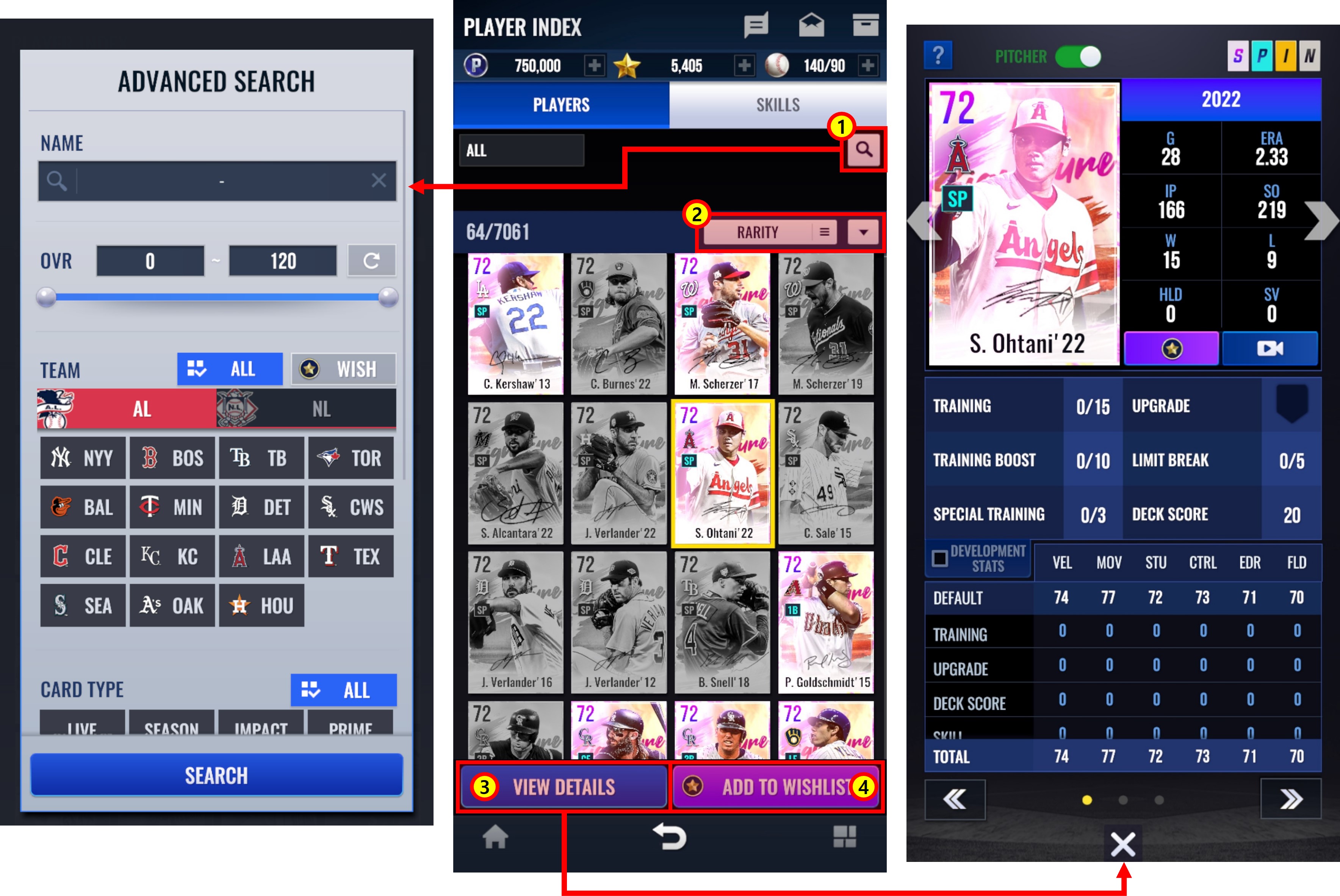 ① Búsqueda de jugadores. La búsqueda avanzada te permite filtrar el nombre, OVR, equipo, tipo/grado de carta y posición.