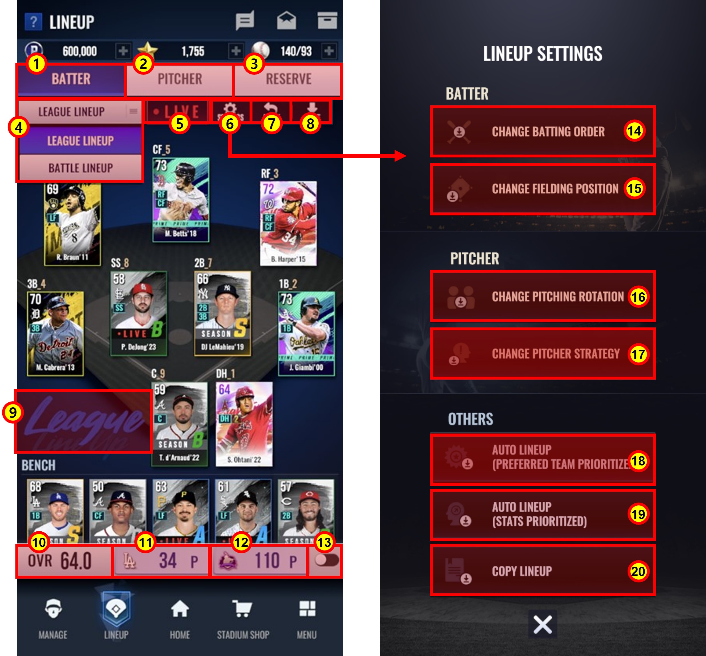 · El orden de bateo, la posición en el campo y la rotación de lanzadores en tu alineación inicial se pueden cambiar en las configuraciones detalladas del menú de alineación.