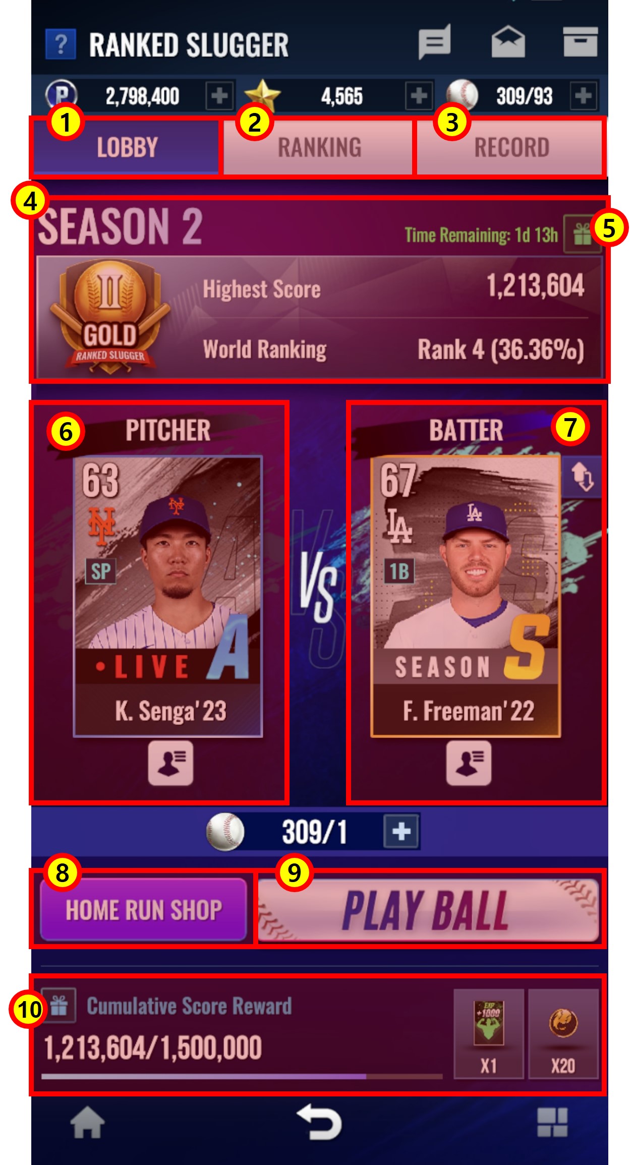 ① Echa un vistazo a la información de la temporada, elige a tu bateador y juega a Bateador Poderoso.