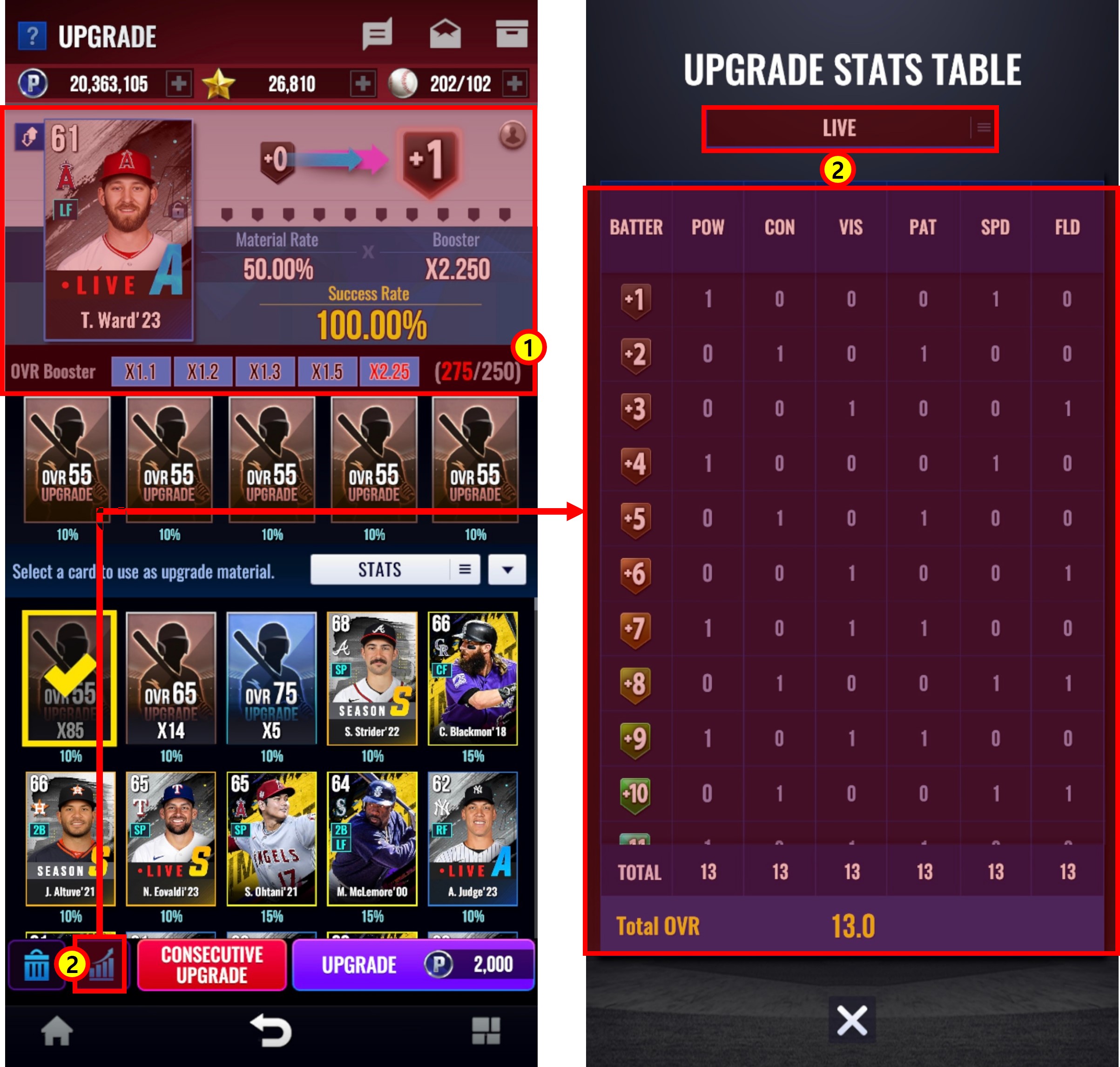 - Hay una restricción mínima de OVR según el nivel de potenciación y el grado del jugador en las cartas que se pueden usar como material.