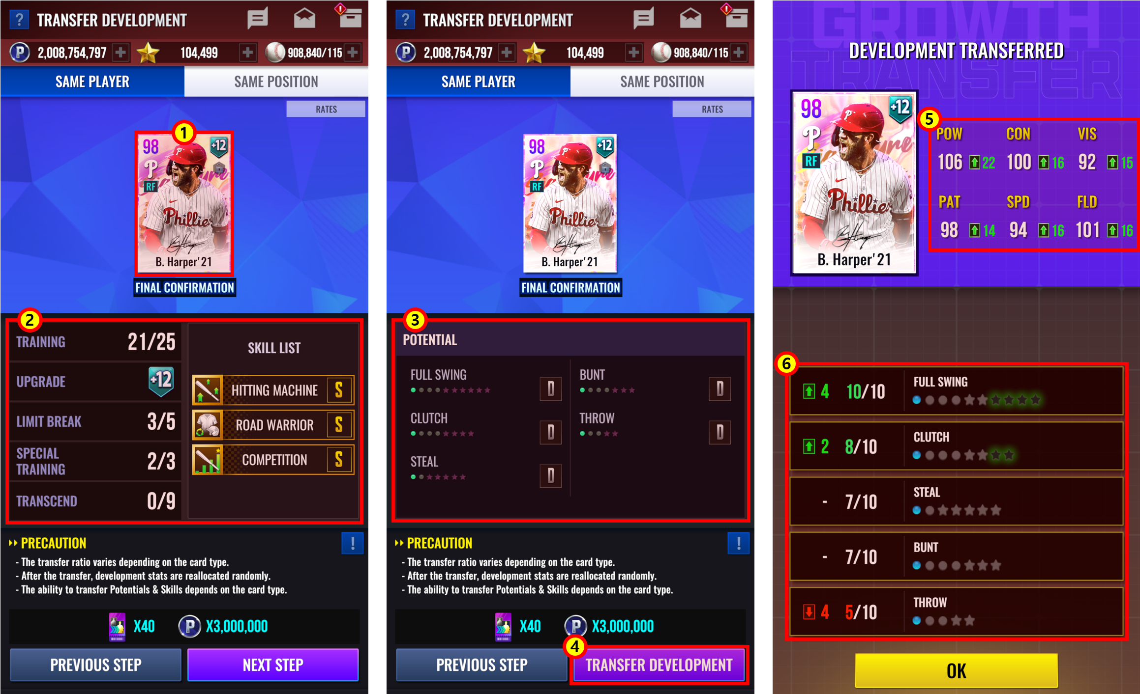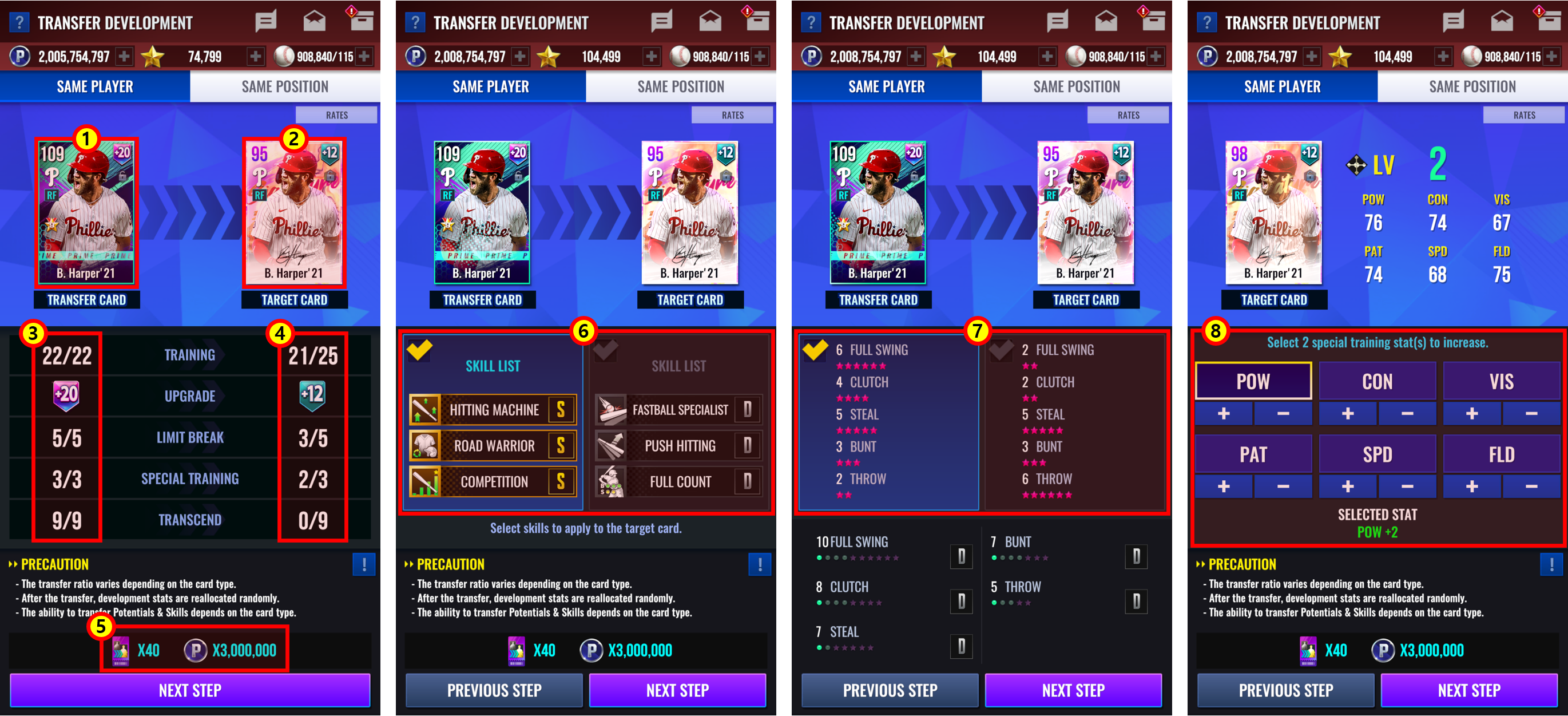 - Puedes elegir uno de los Potenciales de bonificación desbloqueados de cualquiera de las dos cartas. Sin embargo, el tipo de Potencial transferido (por ejemplo, Swing Completo, Batazo oportuno) puede variar según la carta.