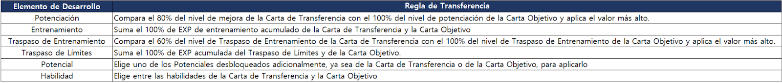 - Dependiendo del nivel de Traspaso de Entrenamiento, una parte de la EXP de entrenamiento transferida puede perderse una vez completada la transferencia de desarrollo.