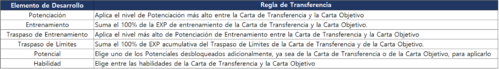 - Puedes elegir qué conjunto de habilidades aplicar, ya sea de la Carta de Transferencia o de la Carta Objetivo.