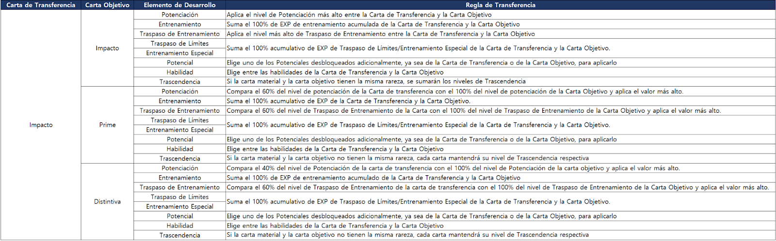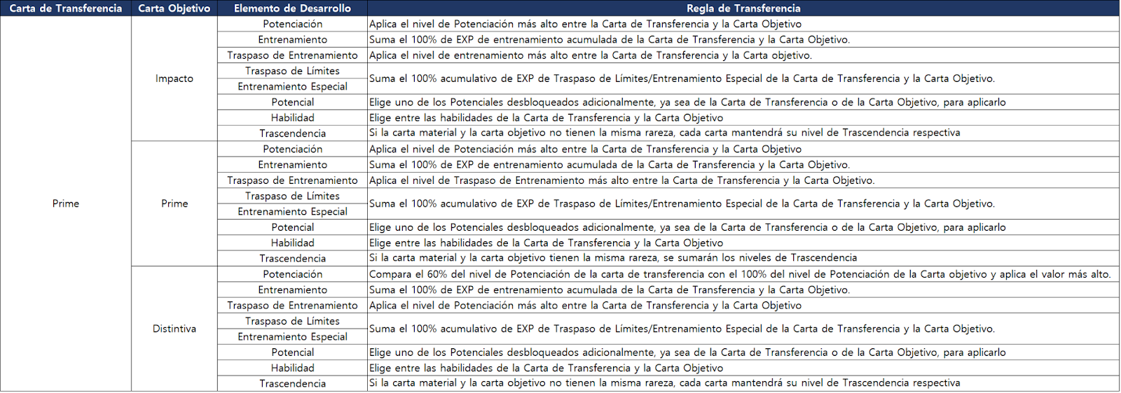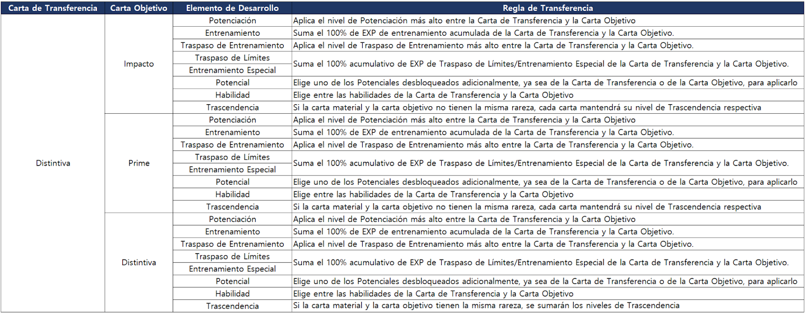 - Si la transferencia no es entre cartas de la misma rareza, el Nivel de Trascendencia de cada carta se mantendrá.