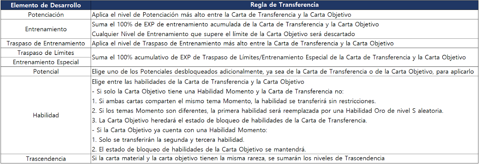 - Las cartas usadas como Cartas de Transferencia no desaparecerán. Todas las estadísticas desarrolladas se restablecerán.