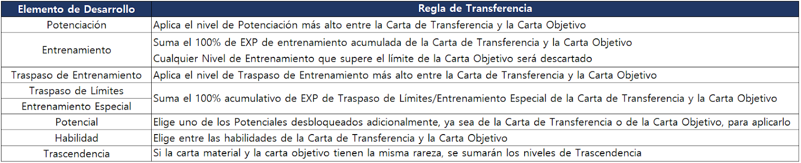 - Si la EXP del Traspaso de Límites de la carta material y la EXP del Entrenamiento Especial excede a la EXP del nivel máx. de la carta objetivo necesaria durante la transferencia del desarrollo, la EXP excedida se descartará.
