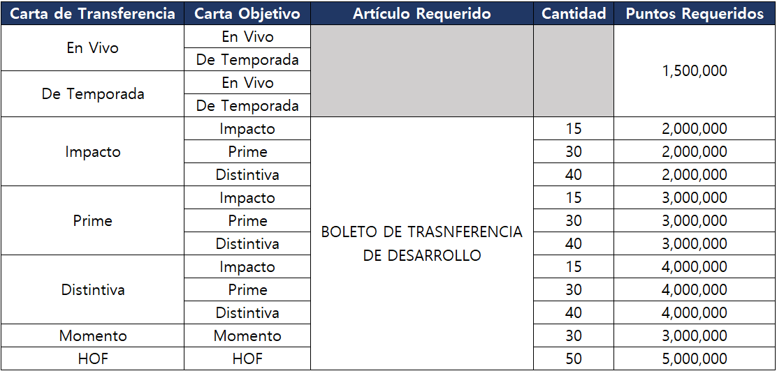 * Las transferencias entre las cartas en Vivo/de Temporada no requieren Boletos de Transferencia de Desarrollo.