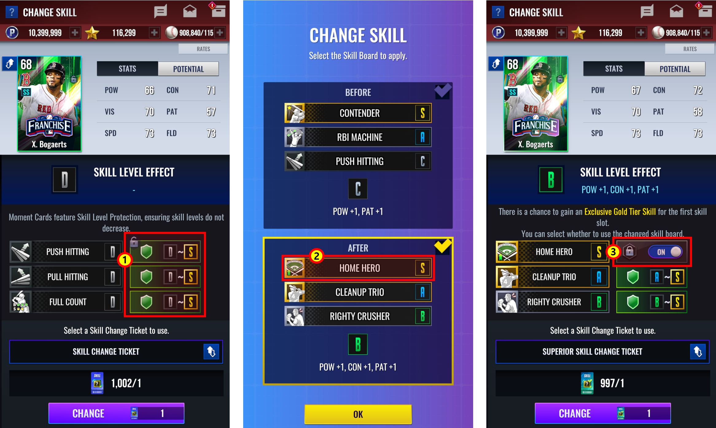 - Las habilidades exclusivas aparecen solo en la primera ranura con los Boletos de Cambio de Habilidad Superiores, y si obtienes una, se garantizan la Categoría Oro y Nivel S.