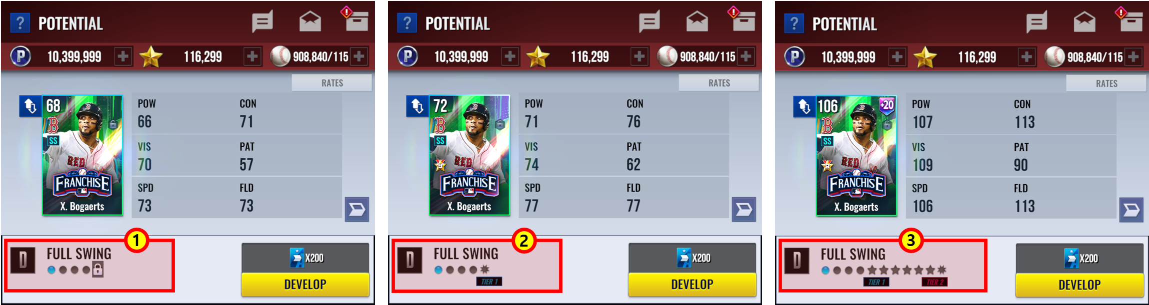 * Para los jugadores de dos vías, el Traspaso de Límites se aplica separadamente para la vía Bateador y la vía Lanzador para ir más allá de la Potenciación niv. 10.