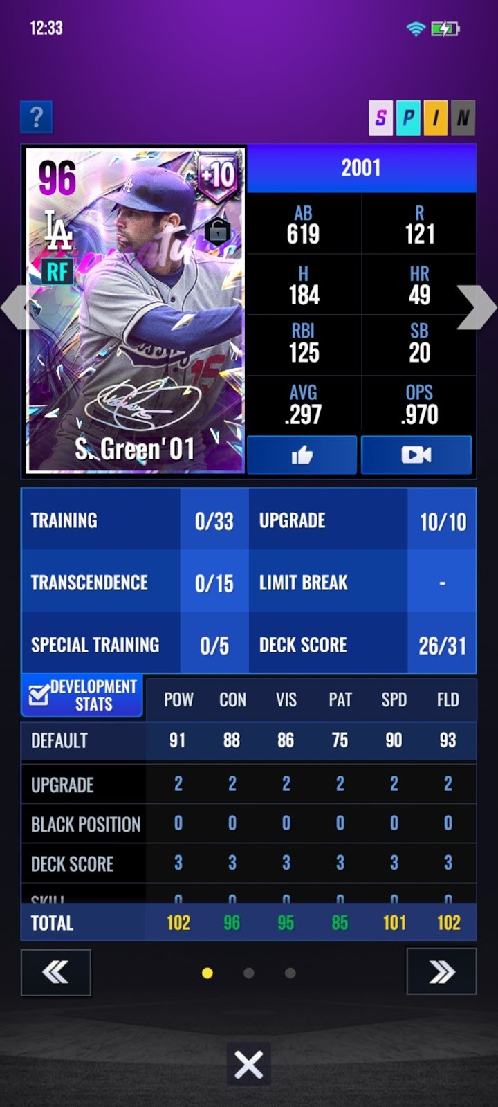 OUTFIELD GUARDIAN | Al colocarse en LF, CF o RF, reduce POT. B. y ROM. B. del lanzador oponente en (2/ 3/ 3/ 4/ 4/ 7/ 9/ 10/ 11) Al colocarse en el número 3, 4 o 5 del orden de bateo, aumenta POT, PRE, VEL y FLD en (1/ 2/ 3/ 4/ 5/ 8/ 10/ 11/ 12) |