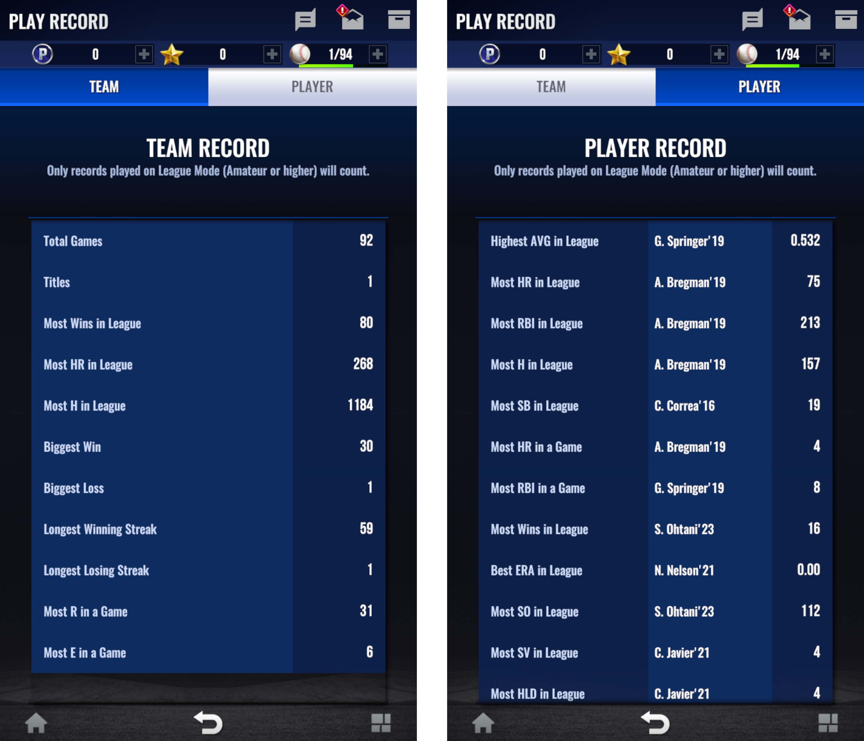 - Puedes examinar el progreso de la liga y el récord de bateo/ lanzamiento, contabilizándose solo los récords jugados directamente en el modo liga en el nivel de dificultad aficionado o superior.