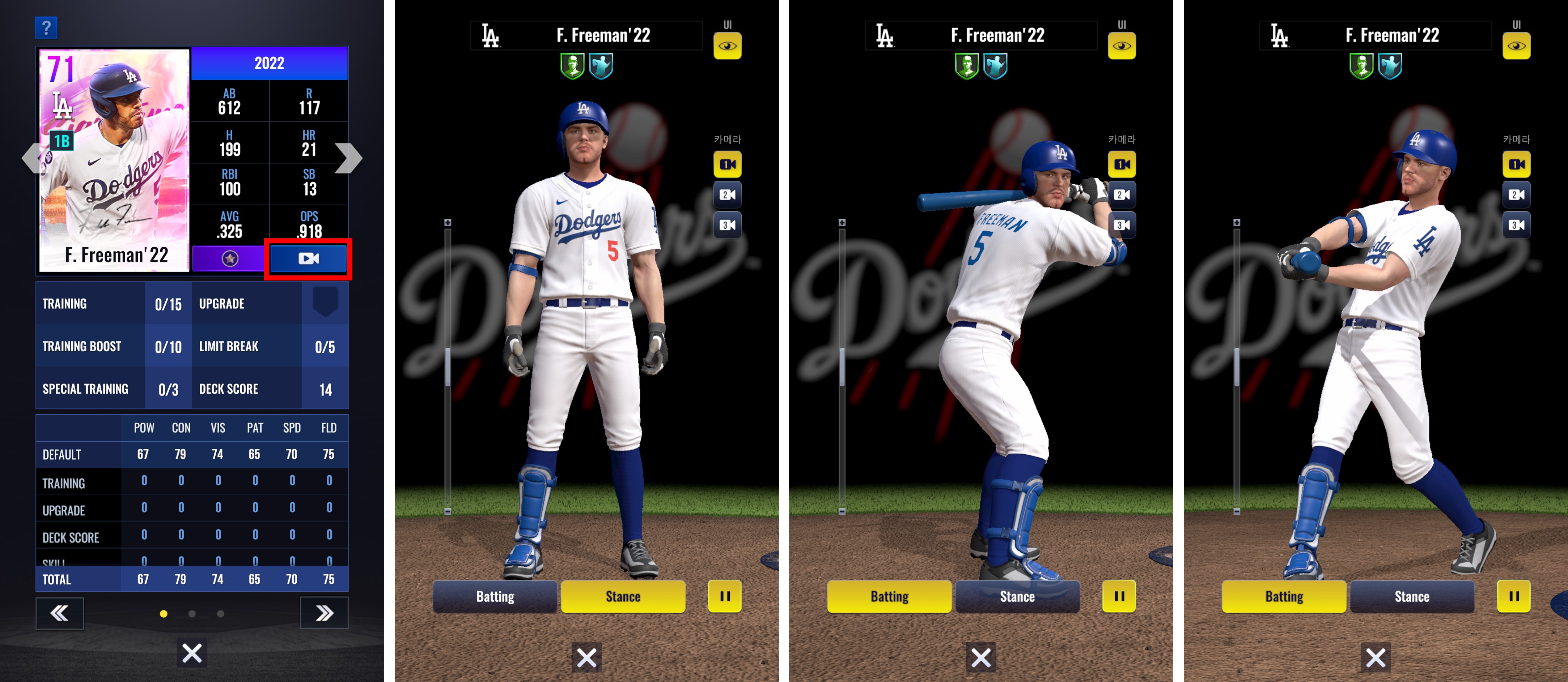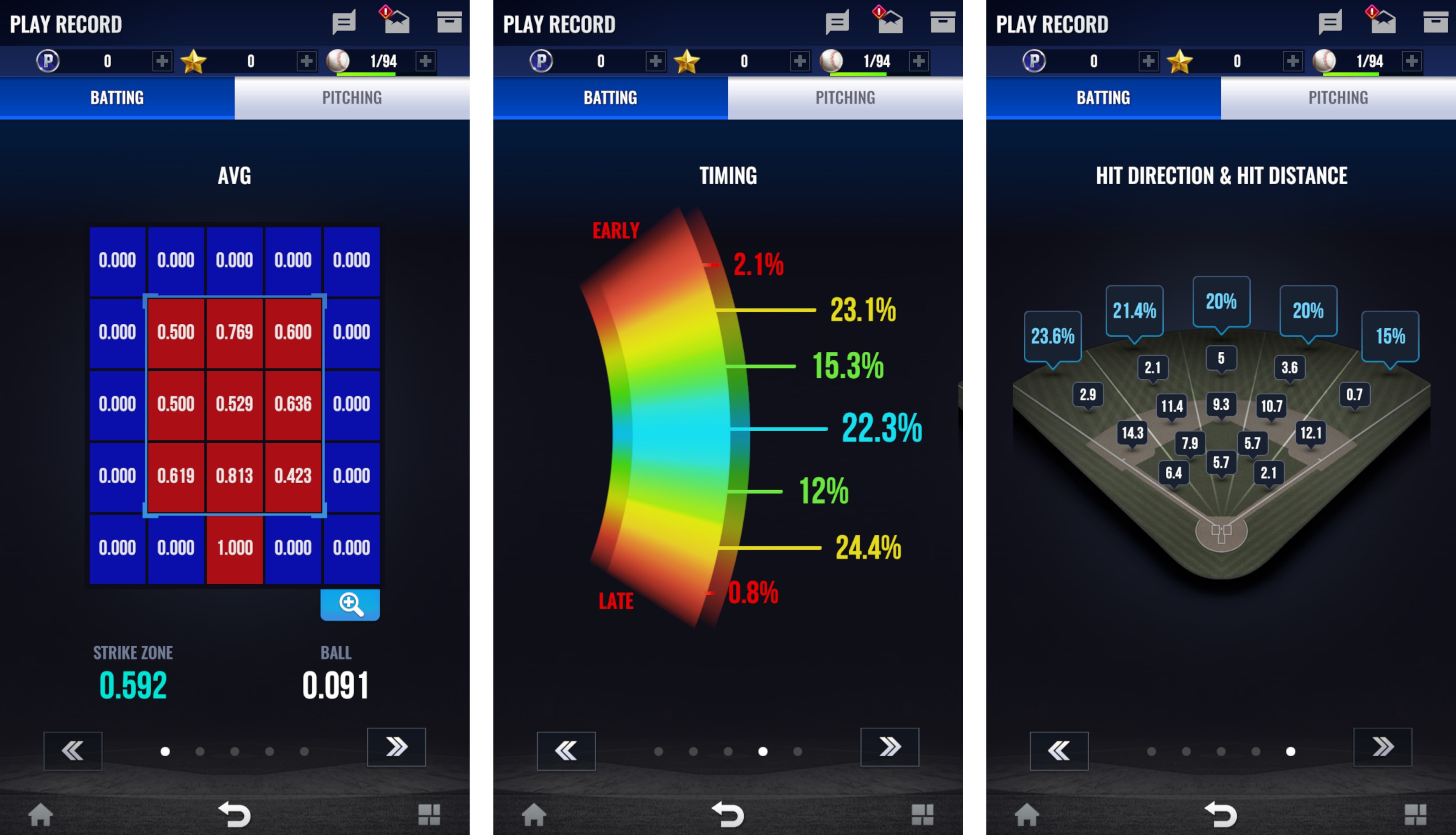 - Los estados de bateo, lanzamiento y de reserva se pueden ver desde varios ángulos de cámara y funciones de zoom.
