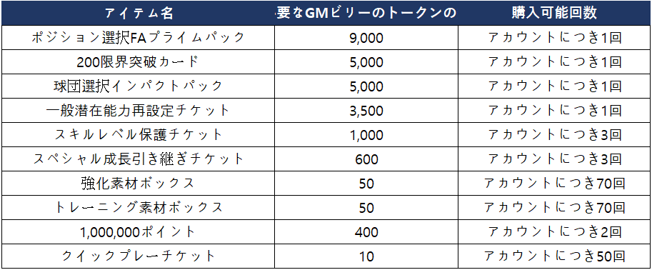 - イベント試合で獲得したGMビリーのトークンはイベントショップでアイテムに交換できます。