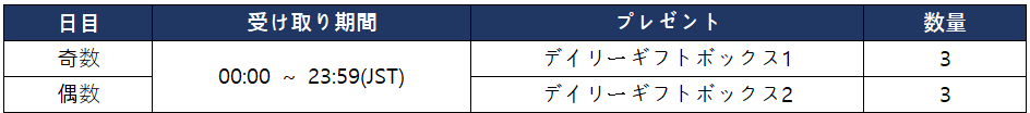 - 14日間、奇数回にはデイリーギフトボックス1を、偶数回にはデイリーギフトボックス2をプレゼントします。