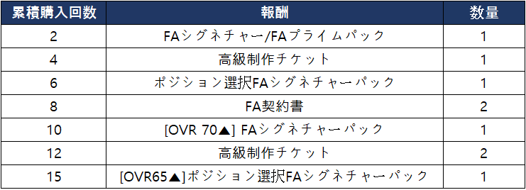 - FAスペシャルパッケージの合計購入回数に応じて以下の報酬を獲得できます。