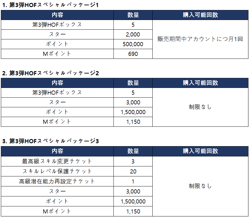 - 第3弾HOFスペシャルパッケージの「合計購入回数」は、次のHOFパッケージ販売時に繰り越されません。