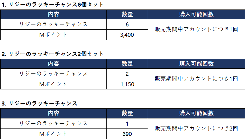 - リジーのラッキーチャンスをオープンすると確率に応じてリストのうちの1種類のアイテムを獲得できます。