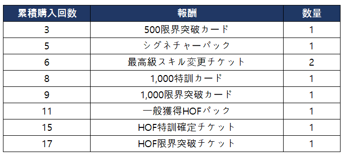 - シーズナルパッケージの合計購入回数に応じて以下の報酬を獲得できます。