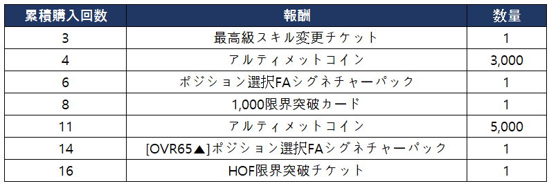 - FAスペシャルパッケージの合計購入回数に応じて以下の報酬を獲得できます。