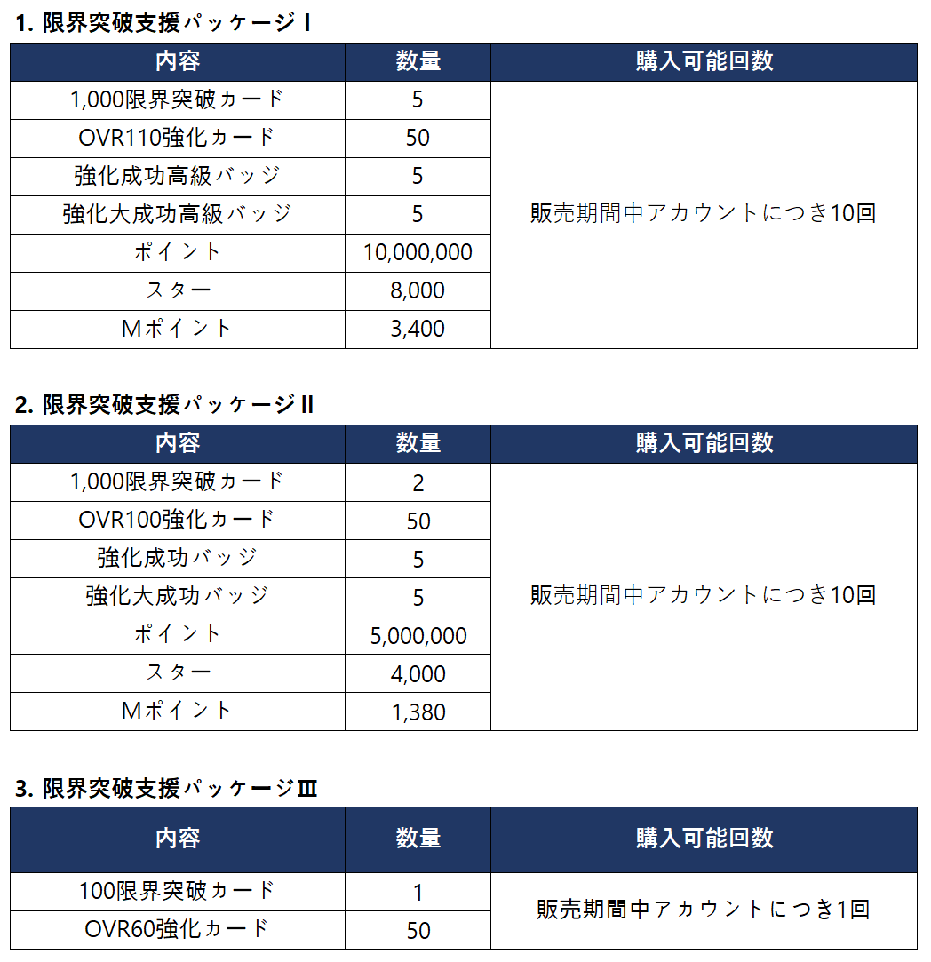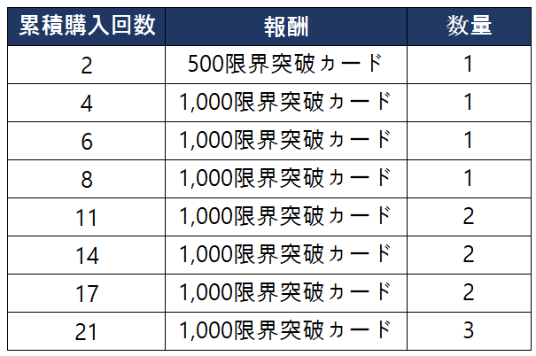 - 限界突破支援パッケージの合計購入回数に応じて以下の報酬を獲得できます。