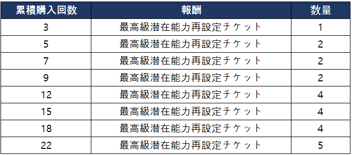 - 潜在能力再設定プレミアムパッケージの合計購入回数に応じて以下の報酬を獲得できます。