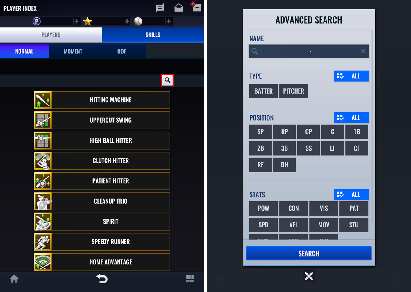 - 詳細検索機能でタイプやポジション、能力値などを選択し、スキルを検索できます。