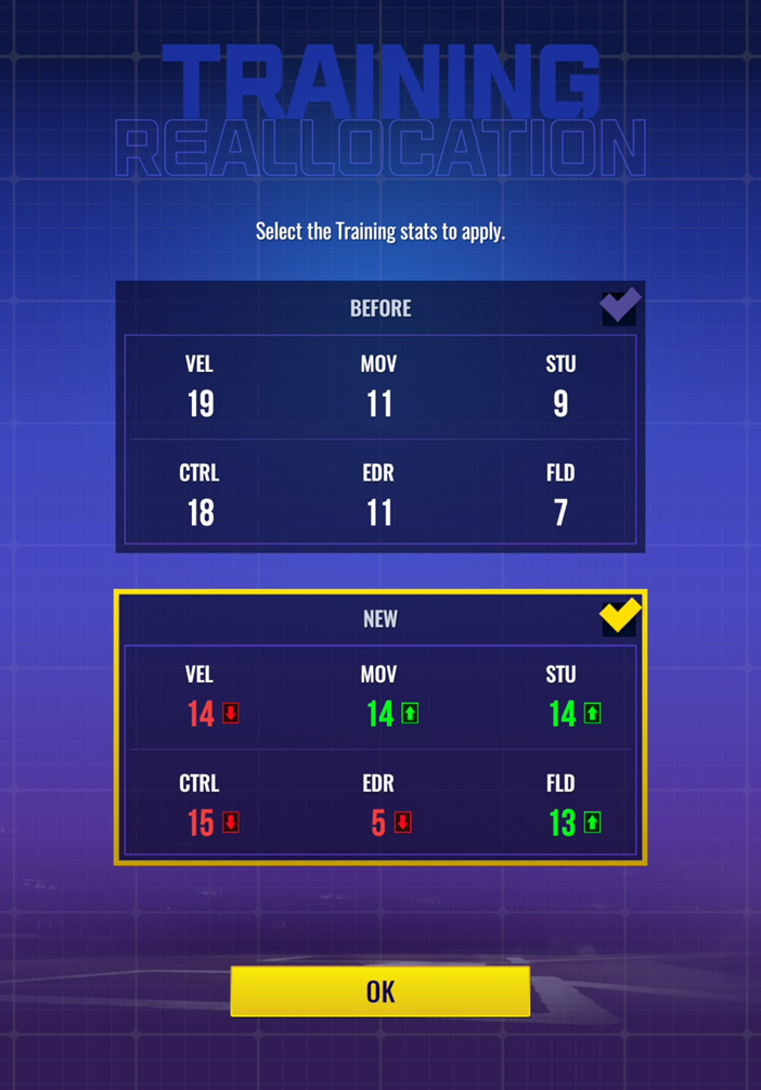 - トレーニング再分配の結果画面で、再分配前と再分配後のトレーニング値のどちらを適用するのかを選択できるようになります。