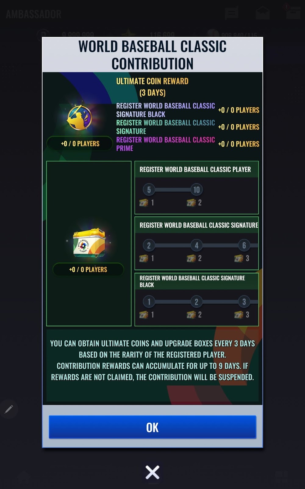 - World Baseball Classicアンバサダーでは、World Baseball Classic選手カードを登録すると「アルティメットコイン」と「World Baseball Classic強化素材ボックス」を獲得できます。