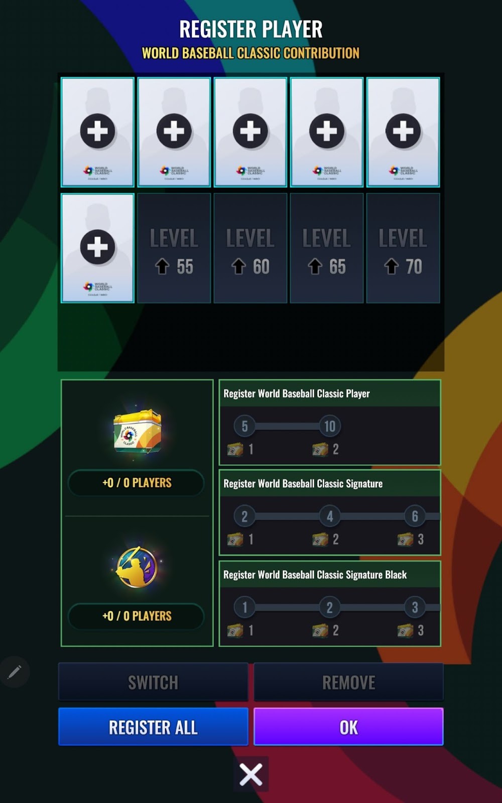 - World Baseball Classicアンバサダーサポートスロットは合計10個あり、全ランクのWorld Baseball Classicカードをスロットに登録することができます。