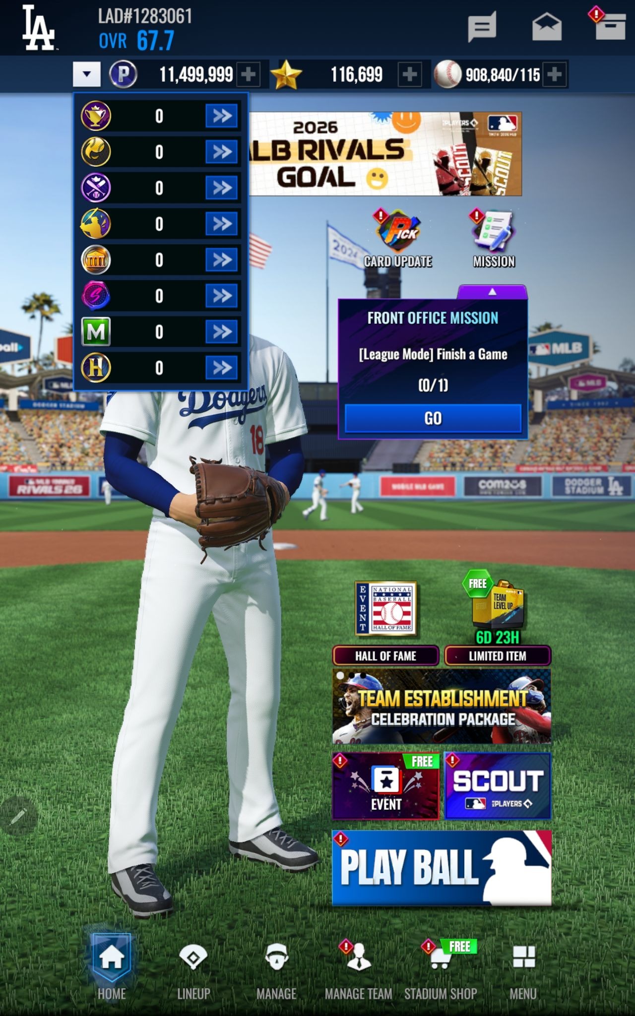 - ゲームを始めたばかりのプレイヤーが各コンテンツでのラインナップを簡単にセッティングできるように、球団レベルが一定のレベルに達するまで一部のコンテンツでのラインナップがロックされます。(アップデート以前からゲームをプレイしていた場合はロックされません。)