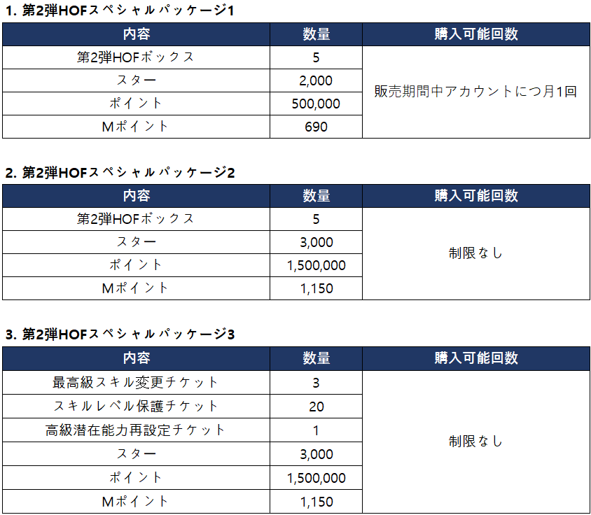 - 第2弾HOFスペシャルパッケージの「合計購入回数」は、次のHOFパッケージ販売時に繰り越されません。