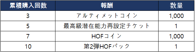- 第2弾HOFスペシャルパッケージの合計購入回数に応じて以下の報酬を獲得できます。