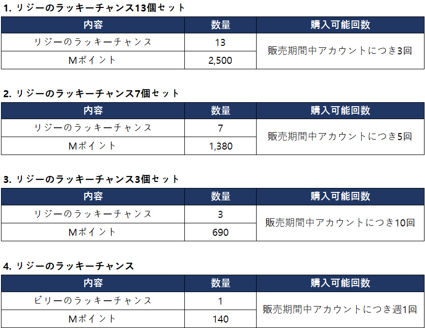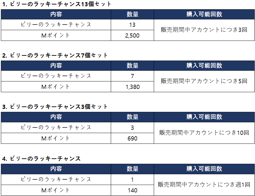 - ビリーのラッキーチャンスをオープンすると確率に応じてリストのうちの1種類のアイテムを獲得できます。
