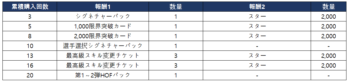 - シーズンパッケージの合計購入回数に応じて以下の報酬を獲得できます。