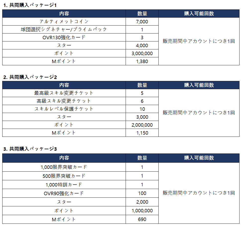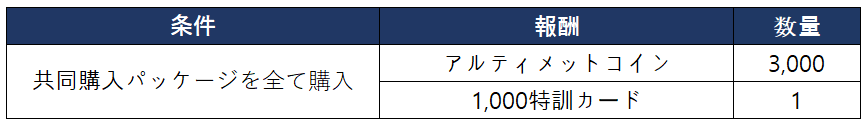 - 共同購入パッケージ1、2、3を全て購入すると追加報酬を獲得できます。