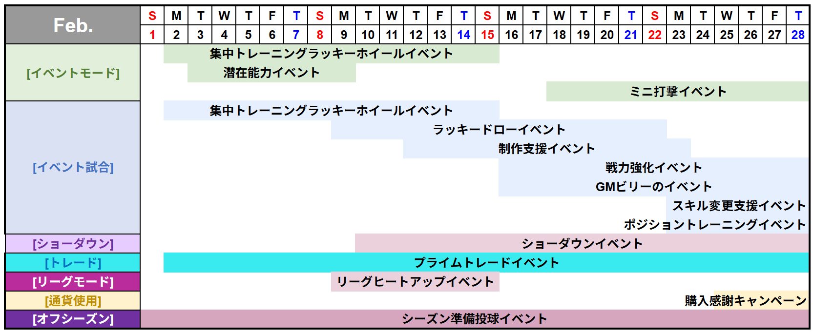 [イベント試合] | 戦力強化イベント | 2月16日 00:00 | 3月1日 23:59 | 14日 |
