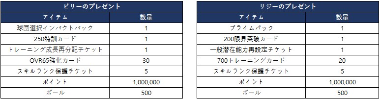 - ビリー&リジーのプレゼントのどちらか1種類を選んで獲得できます。